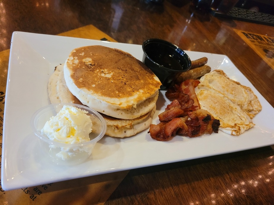 Stacked pancakes, eggs cooked your way, crispy bacon & savory sausage links 🤤